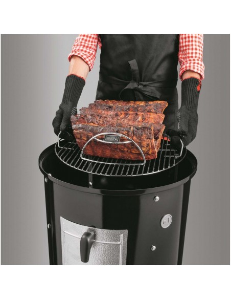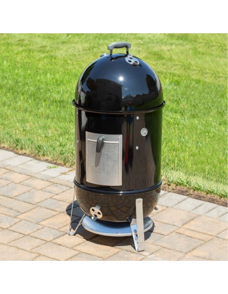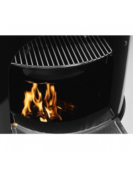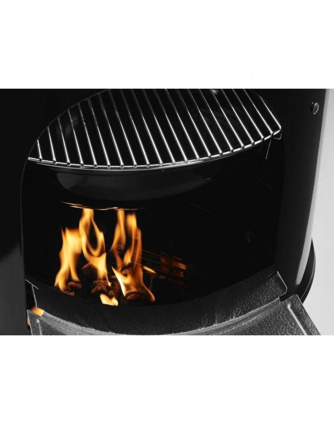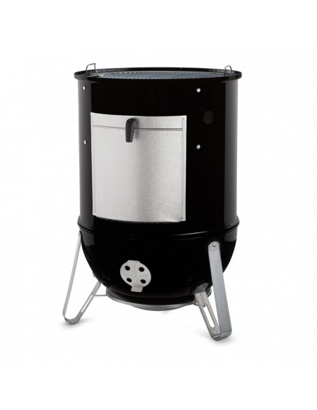 - Отвір, що забезпечує доступ до вугілля під час копчення, з заслінкою з алюмінію. Доступ до вугілля необхідний в тому числі для підкладання тріски, що дає ароматний дим.